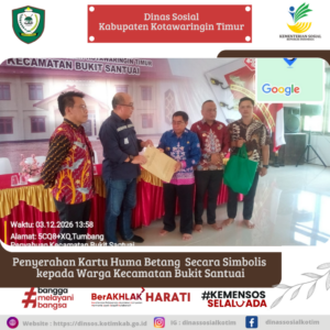 Kepala Dinas Sosial Kabupaten Kotawaringin Timur Hawianan, S.Sos dampingi perwakilan dari Dinas Energi dan Sumber Daya Mineral (ESDM) Provinsi Kalimantan Tengah dalam pelaksanakan kegiatan penyerahan simbolis Kartu Huma Betang kepada Kepala Desa Tumbang Penyahuan Sempung yang berlangsung dengan penuh khidmat dan dihadiri oleh Camat Bukit Santuai dan warga Desa Tumbang