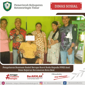 SAMPIT – Dinas Sosial Kabupaten Kotawaringin Timur melalui Pekerja Sosial Ahli Muda (Sumidi) Bidang Rehabilitasi Sosial melaksanakan penyaluran bantuan sosial berupa alat bantu kursi roda kepada salah satu warga Desa Bajarum Kecamatan Kota Besi Kabupaten Kotawaringin Timur. Kepala Desa Bersama Perangkat Desa Bajarum Kecamatan Kota Besi melakukan usulan proposal ke